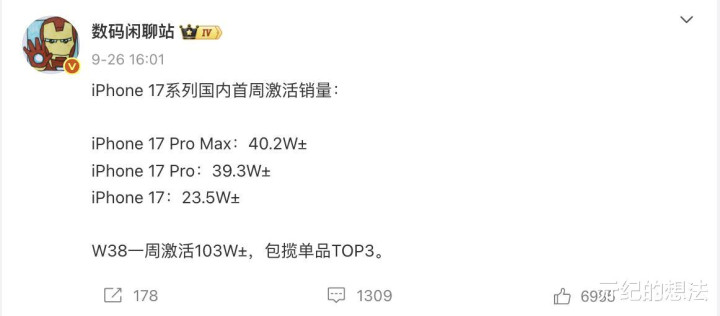对于2025年W38中国手机畅销榜,亓纪的想法是这样的:如果你对iPhone17系列首周销量103万台没啥概念的话,可以看看本周的畅销榜单,前三名和其他机型的差距一目了然,这也是很多国产厂商梦寐以求的事情。下周的看点依旧很精彩,除了活力全开的iPhone17系列以外,还有小米17系列的首发情况,从时间点和机型上来看的话,今年直面iPhone17系列的就是小米17系列。